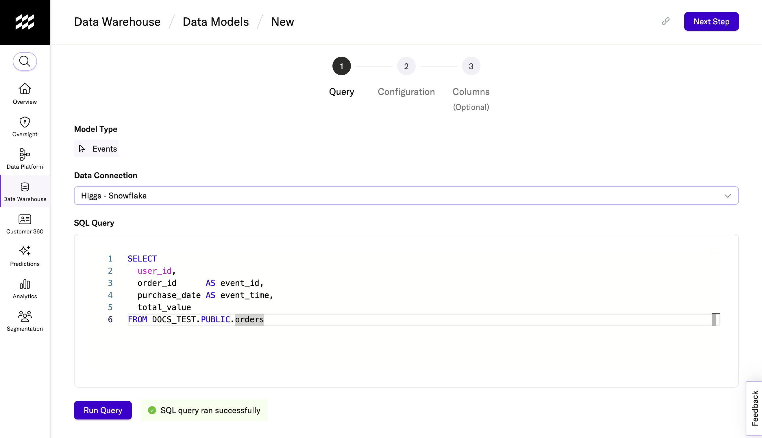 Here is a simple SQL query you might use to define an event data model for purchases: