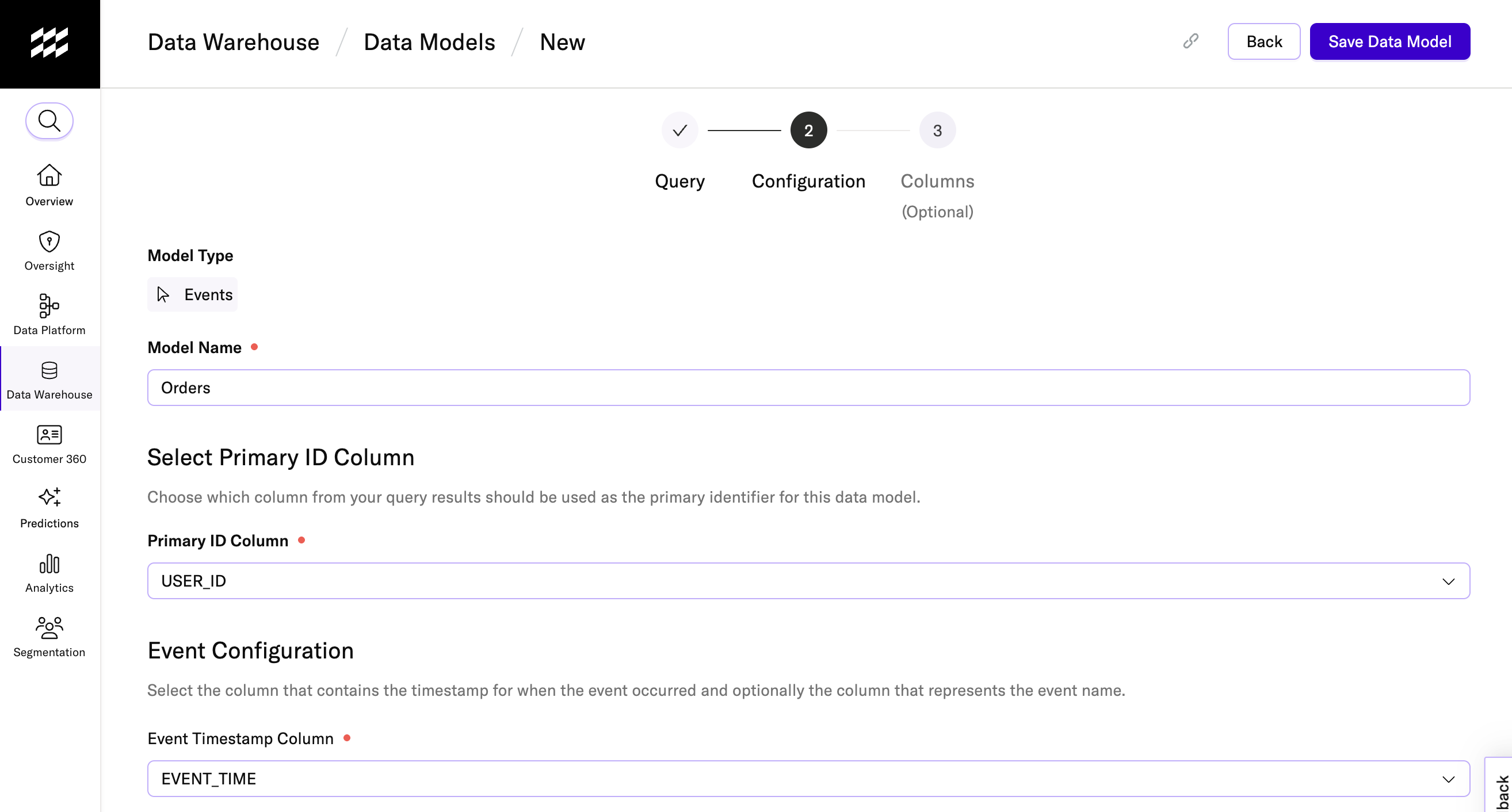) to denote who performed the event.Click Save Data Model to continue.