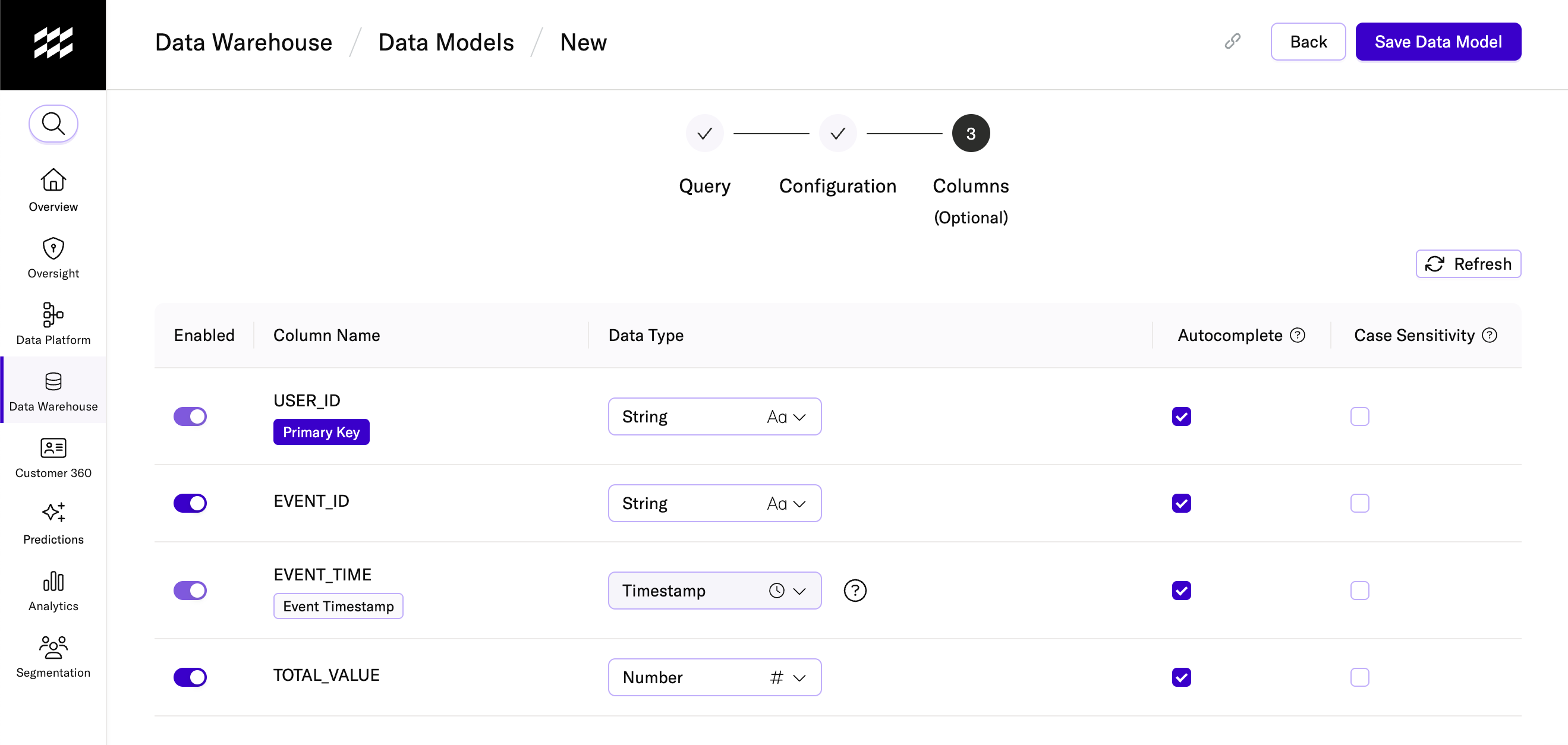 Event Data Models capture timestamped user actions (such as logins, purchases, or conversions) that can be used to refine or enrich your audience definitions. These models pull event-level data from your cloud data warehouse and link back to a User Data Model using a shared identifier (for example, user_id