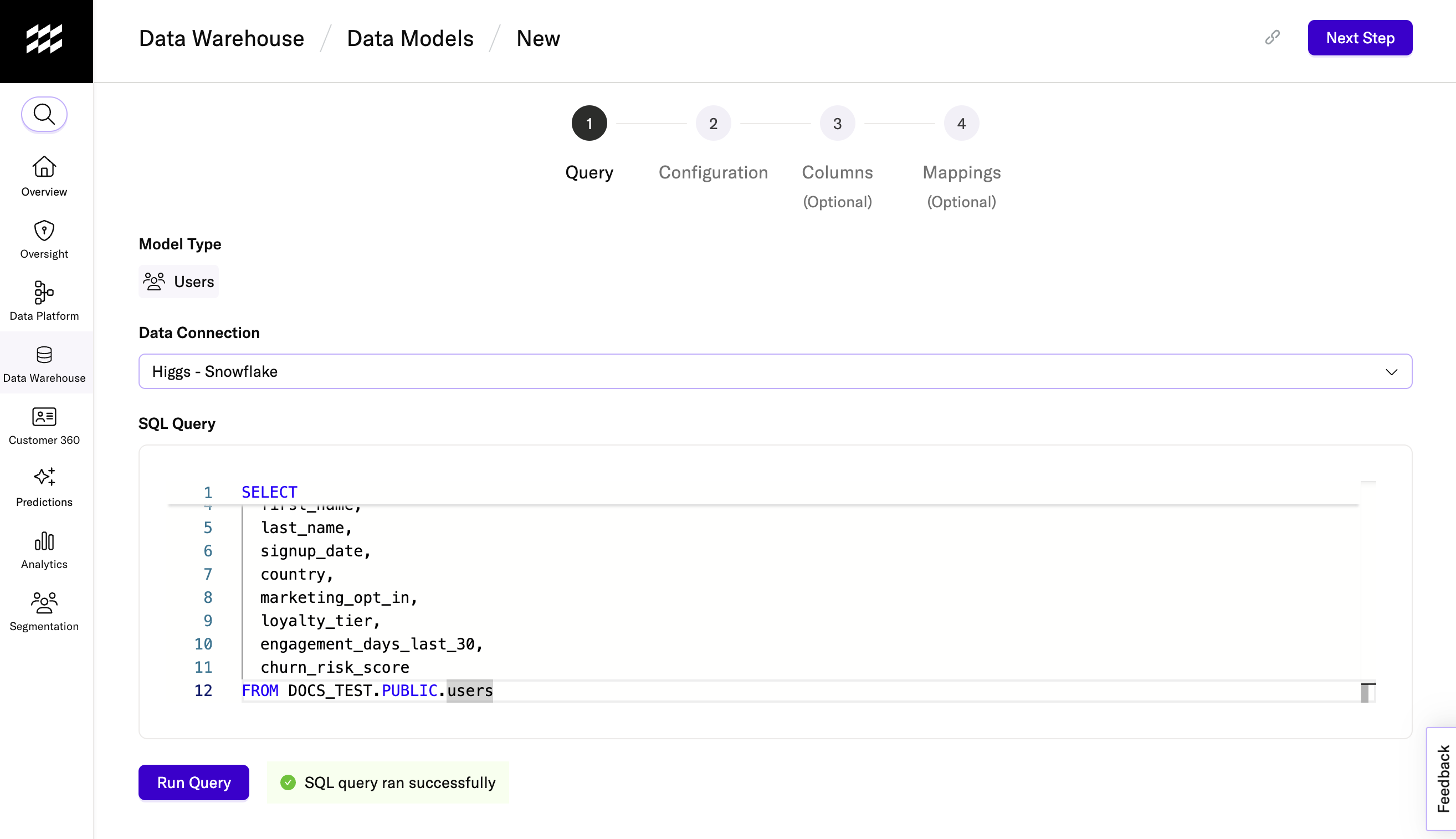Here is a simple SQL query you might use to define a user data model for your customers: