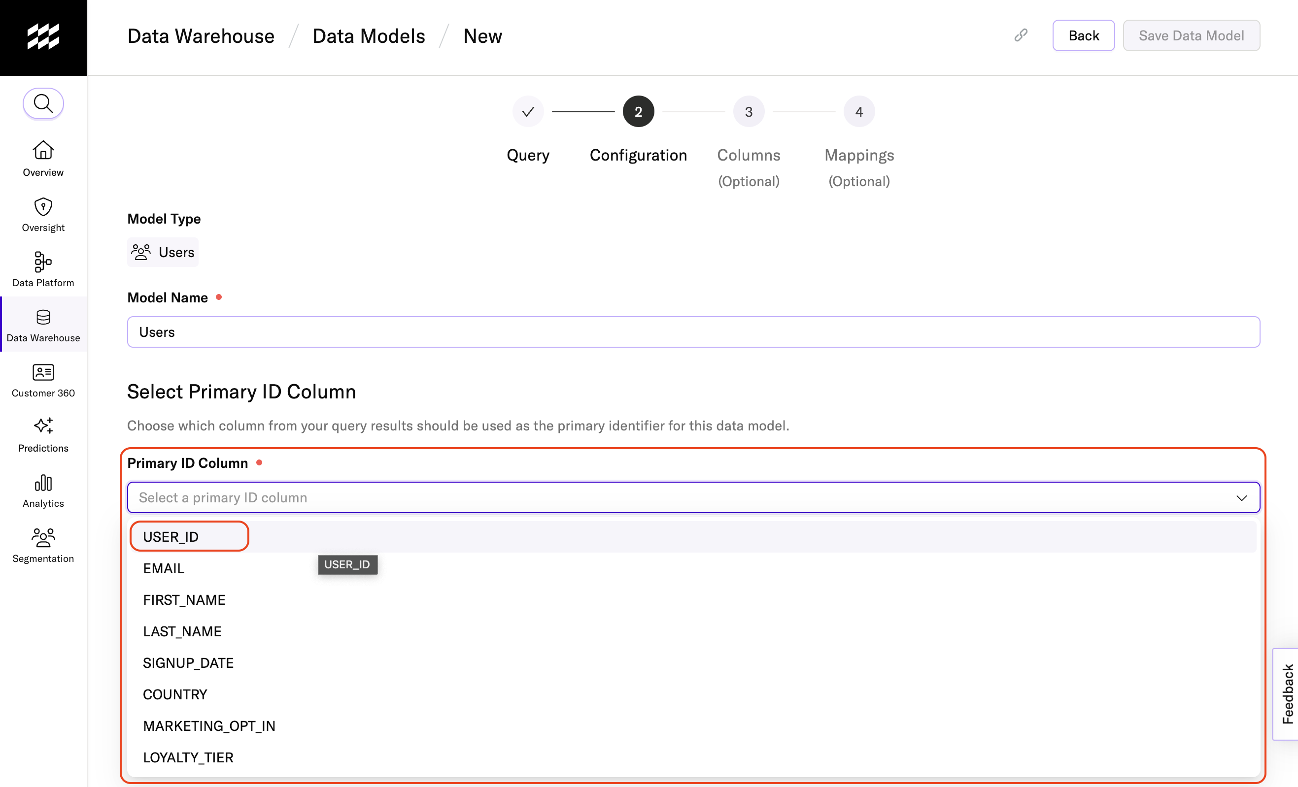 ) retrieved from your SQL query to serve as the unique identifier for each user.Click Save Data Model to continue.