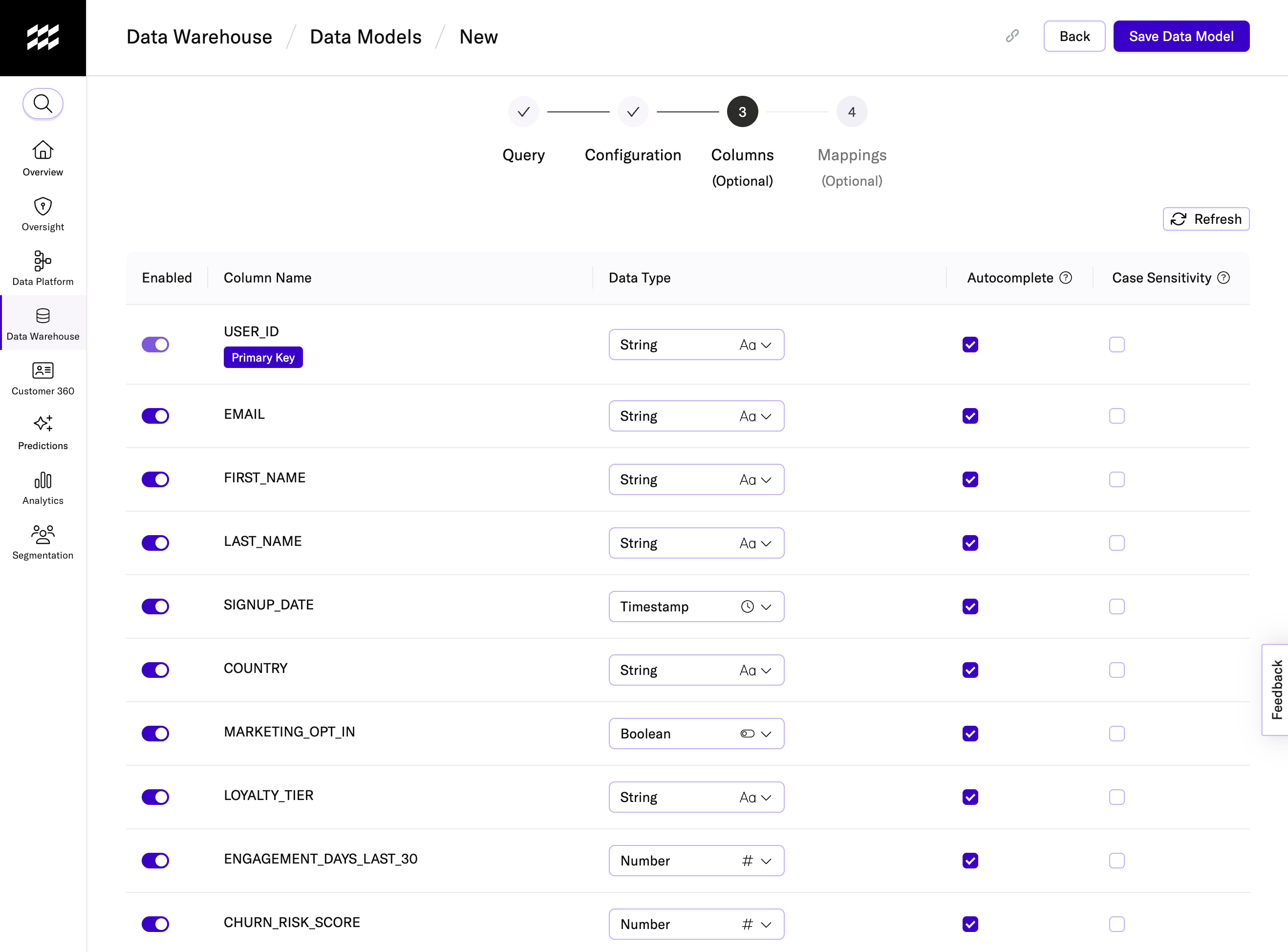 User Data Models define the core user dataset that Composable Audiences uses for segmentation. You must create at least one user data model in order to create a composable audience. Like all data models, they are built from a SQL query that selects user records and attributes from your cloud data warehouse, with a required primary ID column to uniquely identify each user. This model forms the foundation for all audiences and can be linked to other models, such as events or subscriptions, for richer targeting.