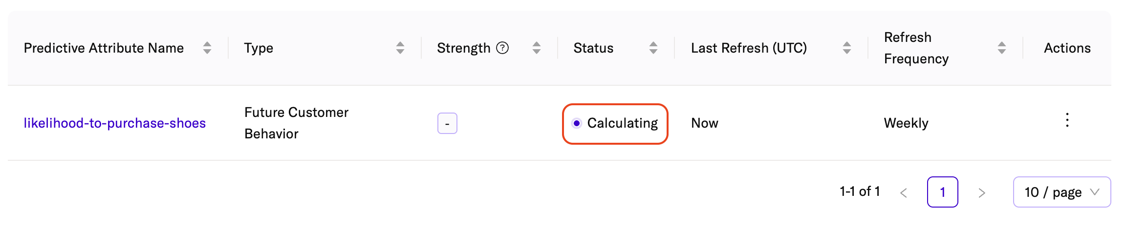 After creation, the new prediction appears on the Predictive Attributes page with its current quality and status. While the prediction is still processing, its status will display as Calculating until mParticle’s machine learning model has generated prediction values for all relevant users.