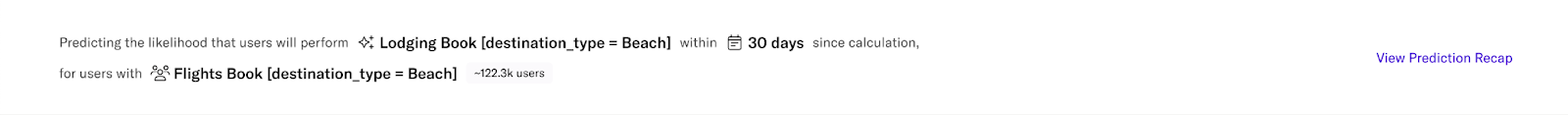 The Prediction Recap gives you a quick snapshot of what this prediction is measuring. It summarizes the target behavior, the prediction window, and the users for whom the prediction will be made. Use this section to confirm that you’re viewing the right prediction, understand its overall scale, and get a quick sense of the opportunity before diving into the detailed results or creating an audience for a range of targeted users.