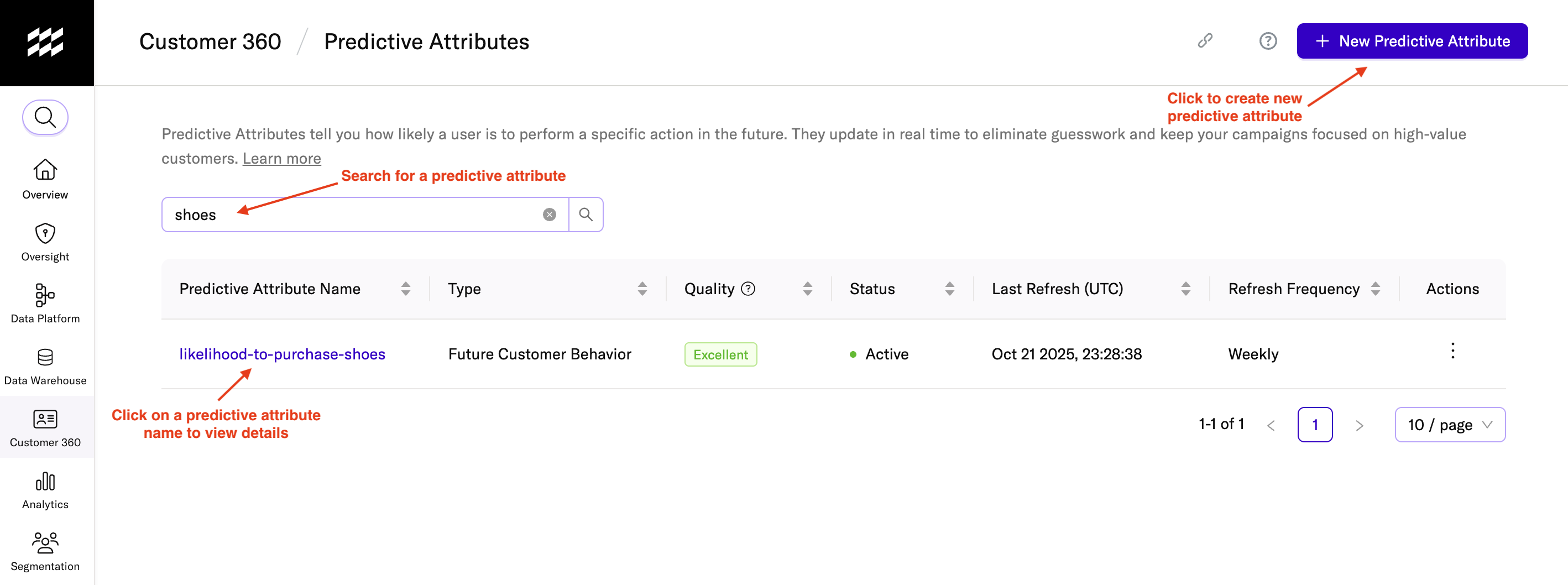 Navigate to Customer 360 > Predictive Attributes using the left-hand navigation.