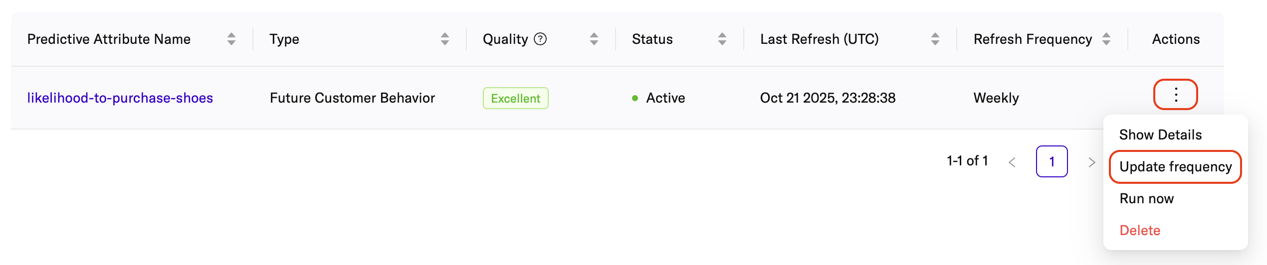 | Actions | Opens a menu with options to show details, update frequency, run now, or delete the predictive attribute. |
