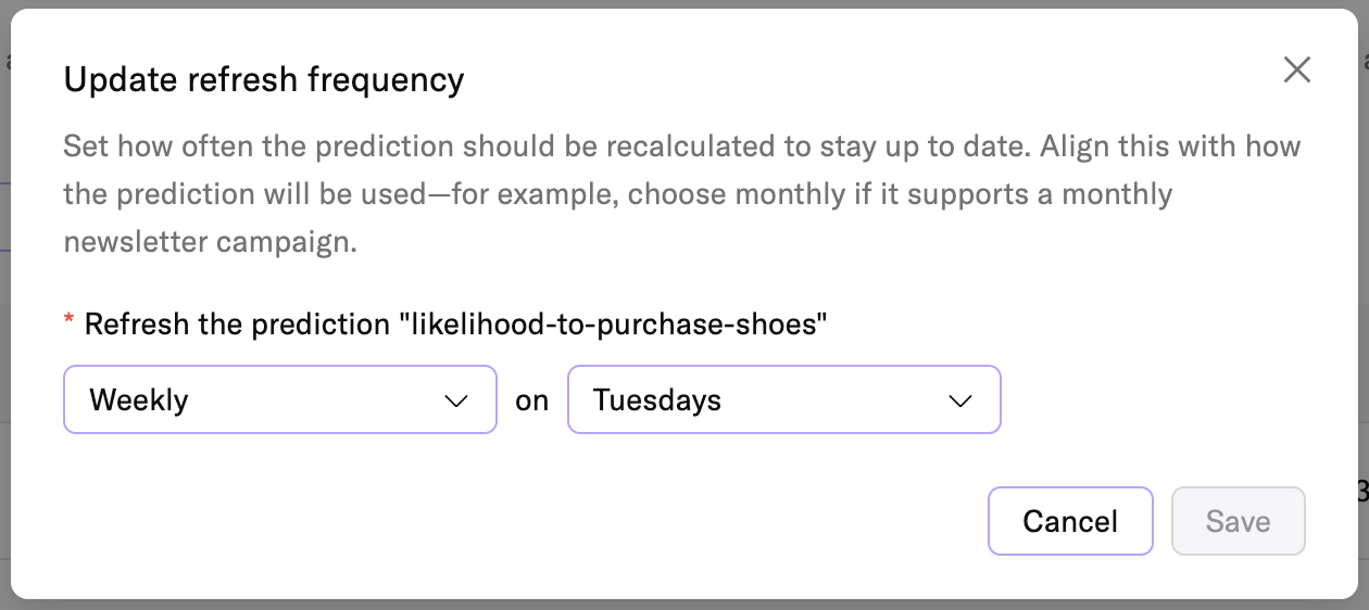 Regular refreshes ensure predictions stay current with the latest user behavior. To change a predictions’s update frequency: