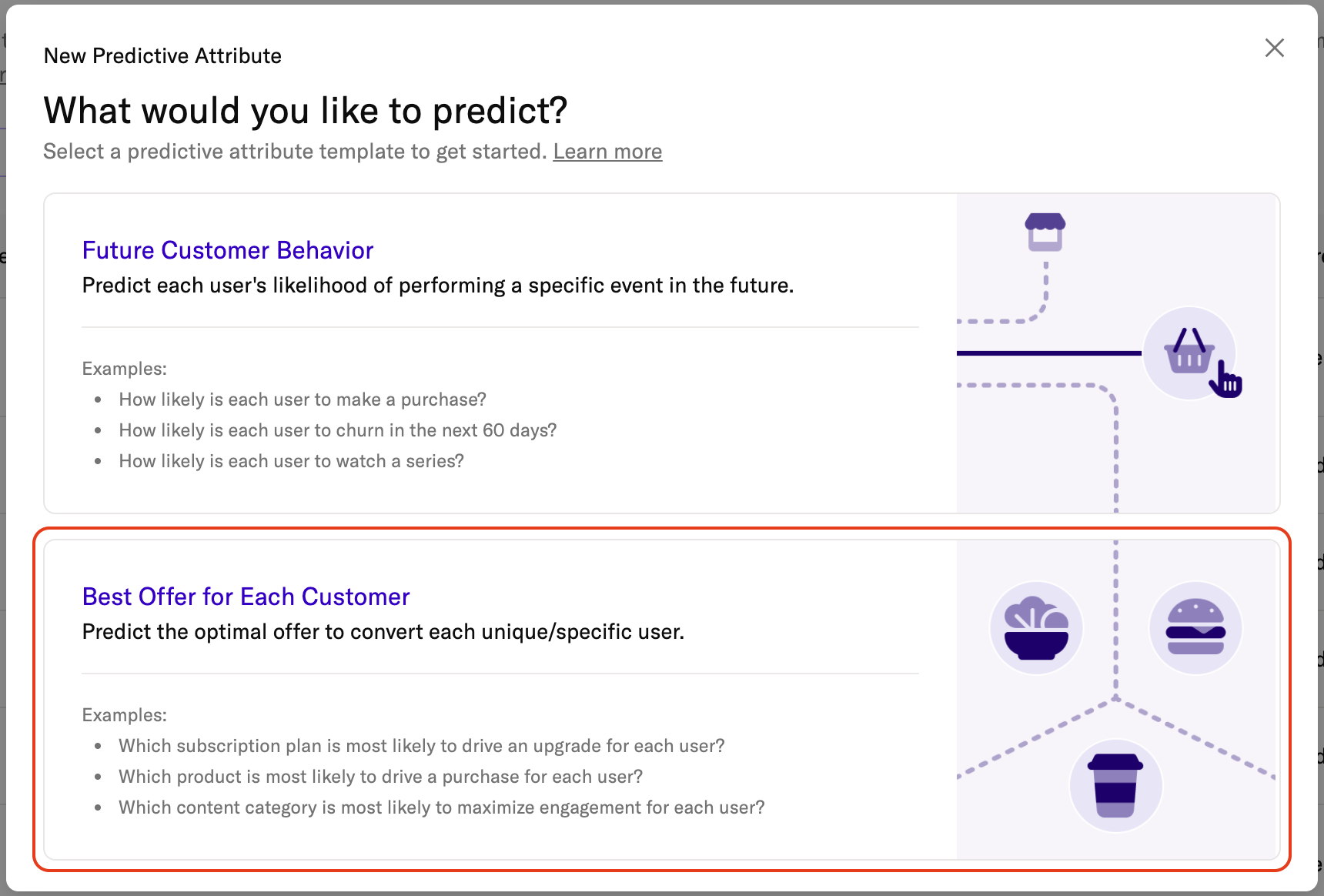 You can use next best action predictions to determine which offer or action is most likely to drive your desired business outcome for each individual user. To learn more about how these prediction types work and their best use cases, see Next Best Actions Overview.
