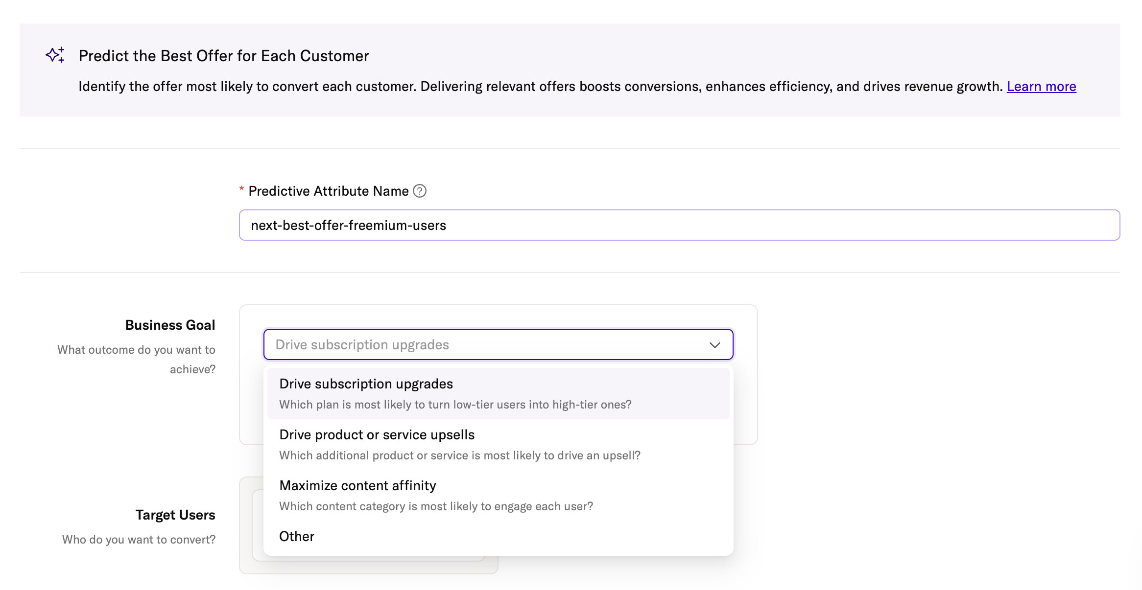 Under Target Users, define who you want to convert by selecting either All Users or For users who. We recommend defining a subset of users to make predictions more precise.
