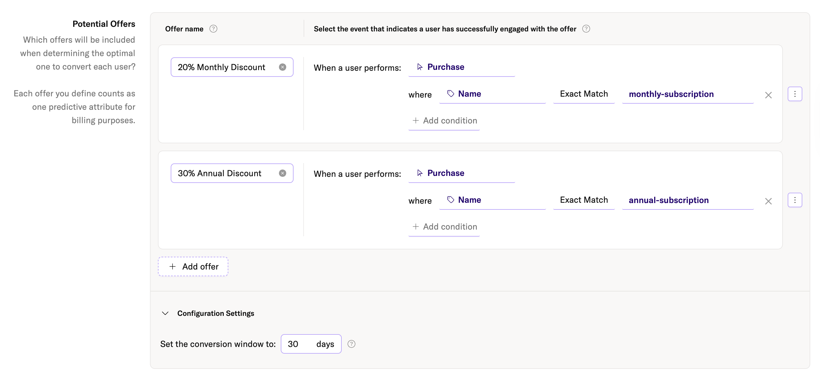 Under Potential Offers, define the offers or actions you want the prediction to evaluate.