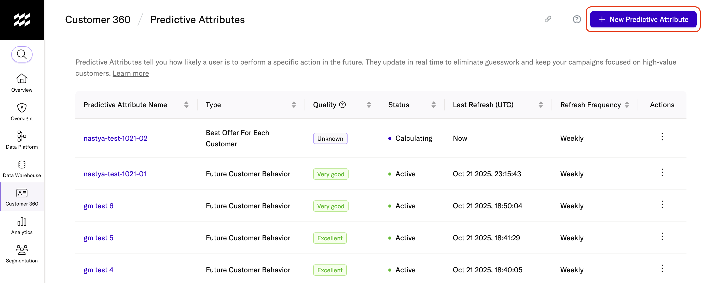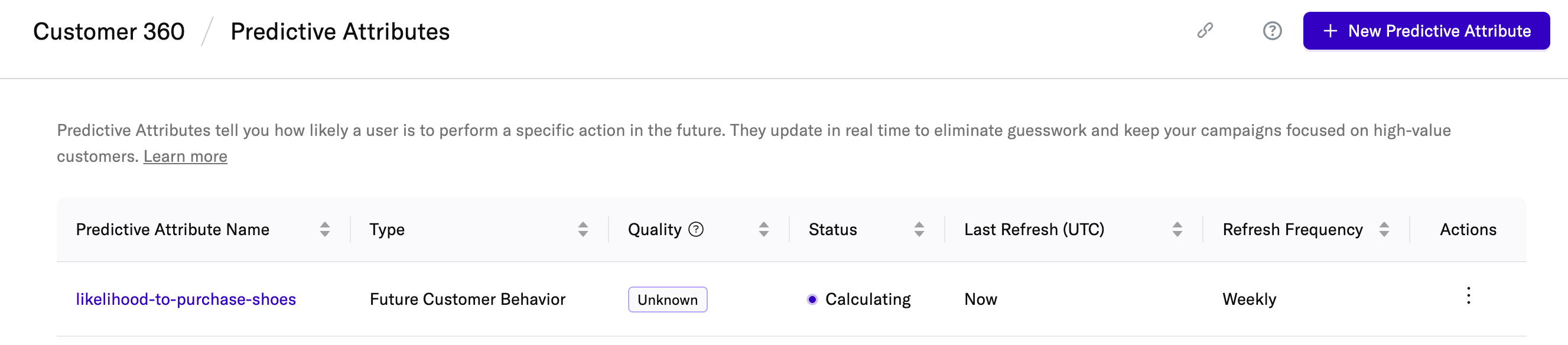 After creation, the new prediction appears on the Predictive Attributes page with its current quality and status. While the prediction is still processing, its status will display as Calculating until mParticle’s machine learning model has generated prediction values for all relevant users.