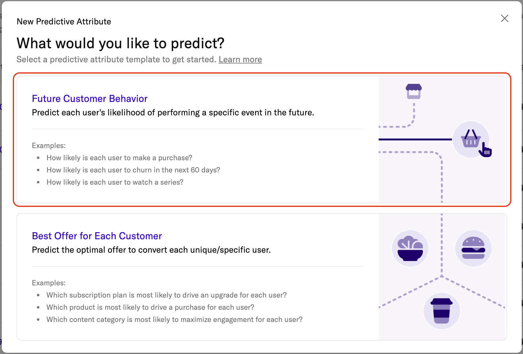 You can use future behavior predictions to estimate how likely users are to perform a specific action in the future. To read about how future behavior predictions work and what their best use cases are, see Future Behavior Predictions Overview.
