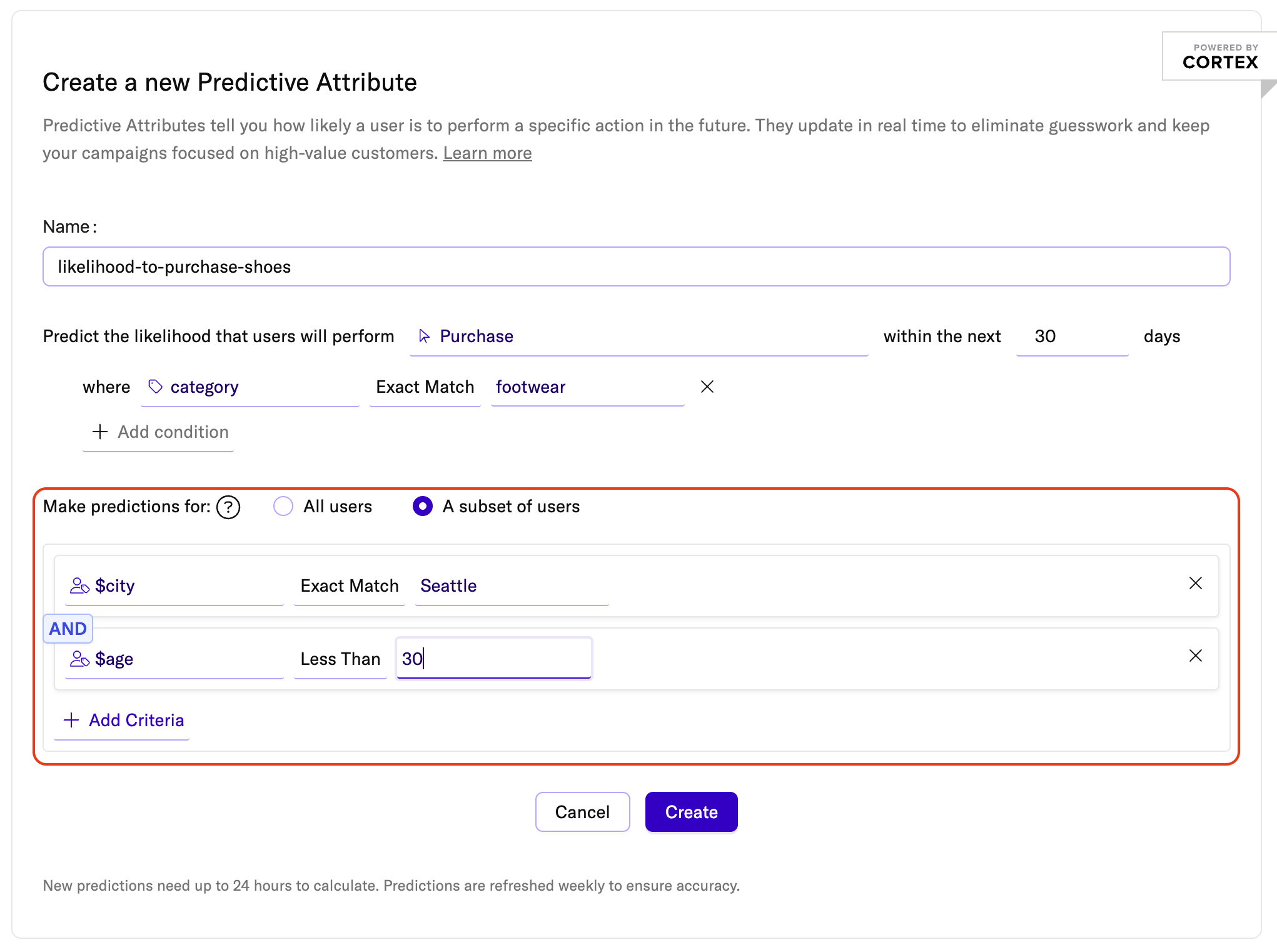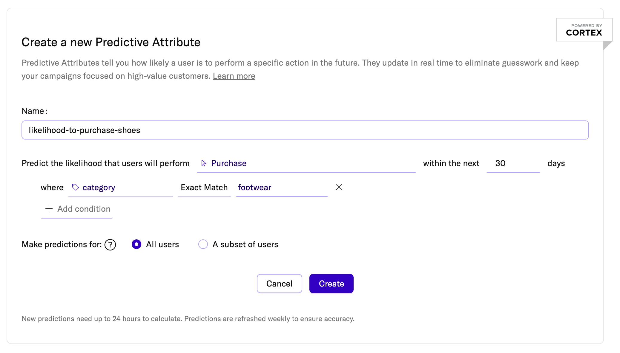 Next, select whether your predictive attribute should apply to All users or A subset of users.