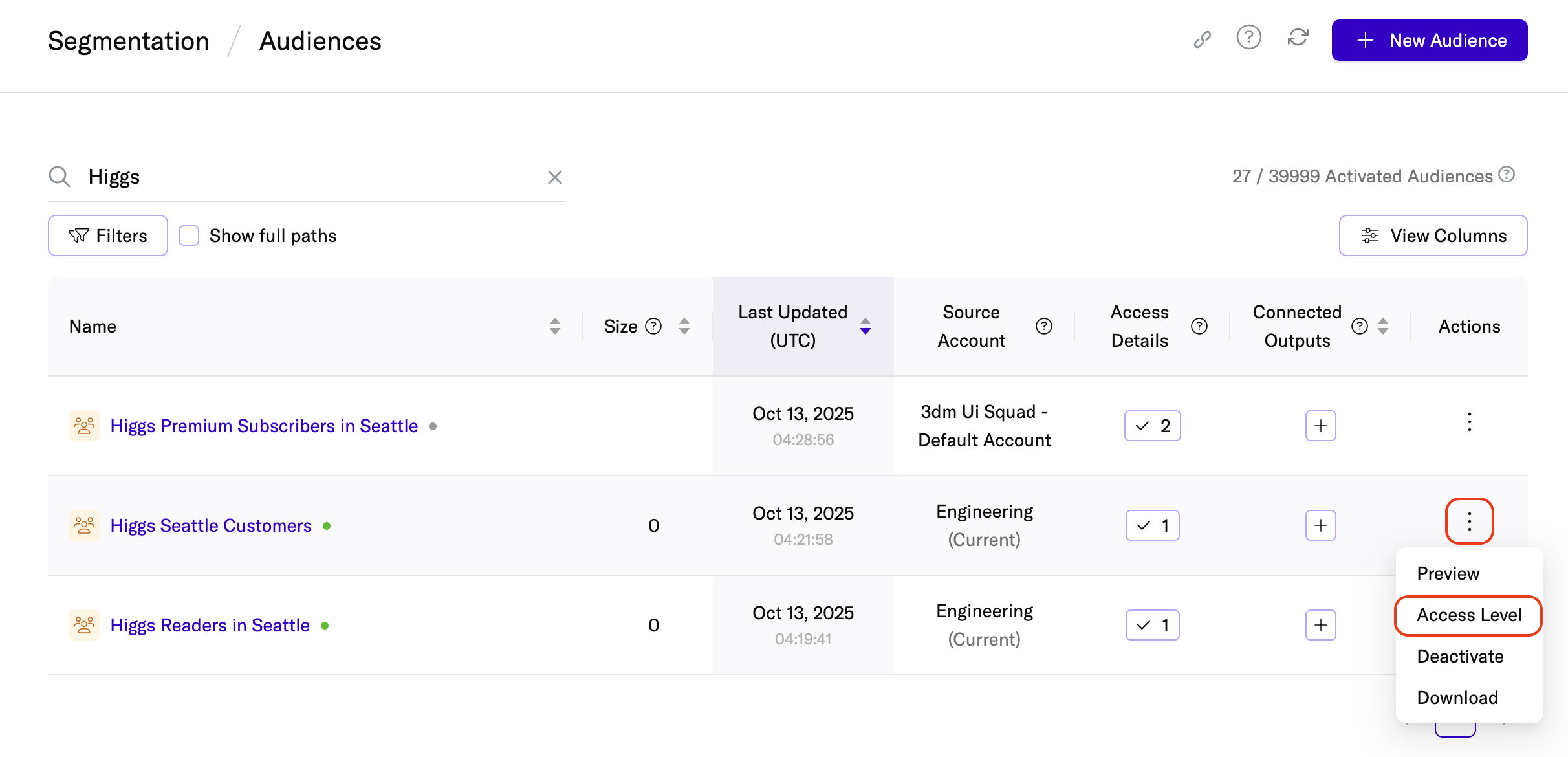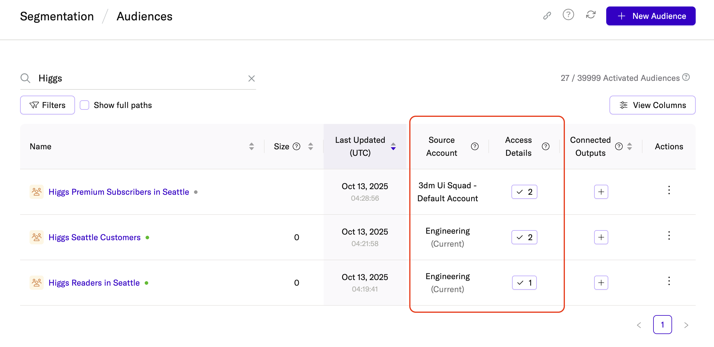 The Access Details column includes an icon for each audience that indicates how many accounts have access to the audience (this is represented by the number in the icon) and current account’s access level (represented by either a checkmark symbol or an eye).