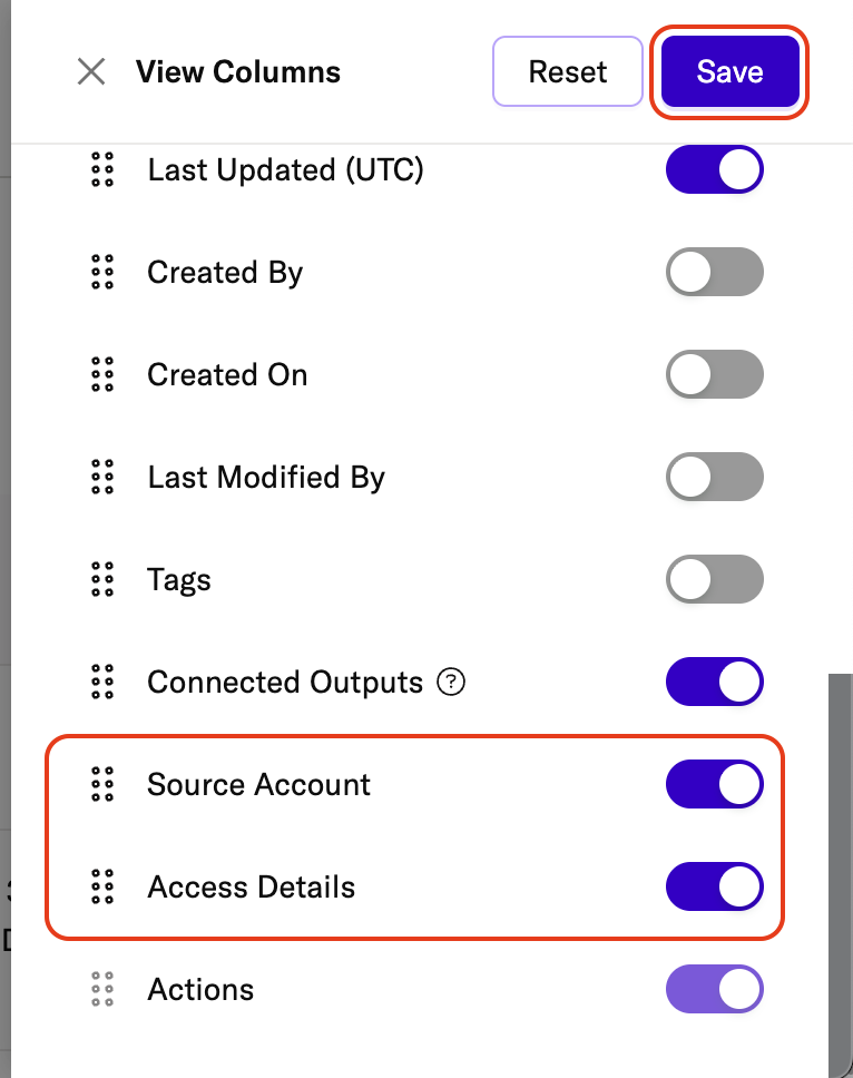 To view the audience sharing columns on the Audiences Landing Page, click the View Columns button and use the toggle buttons to enable Source Account and Access Details before clicking Save.