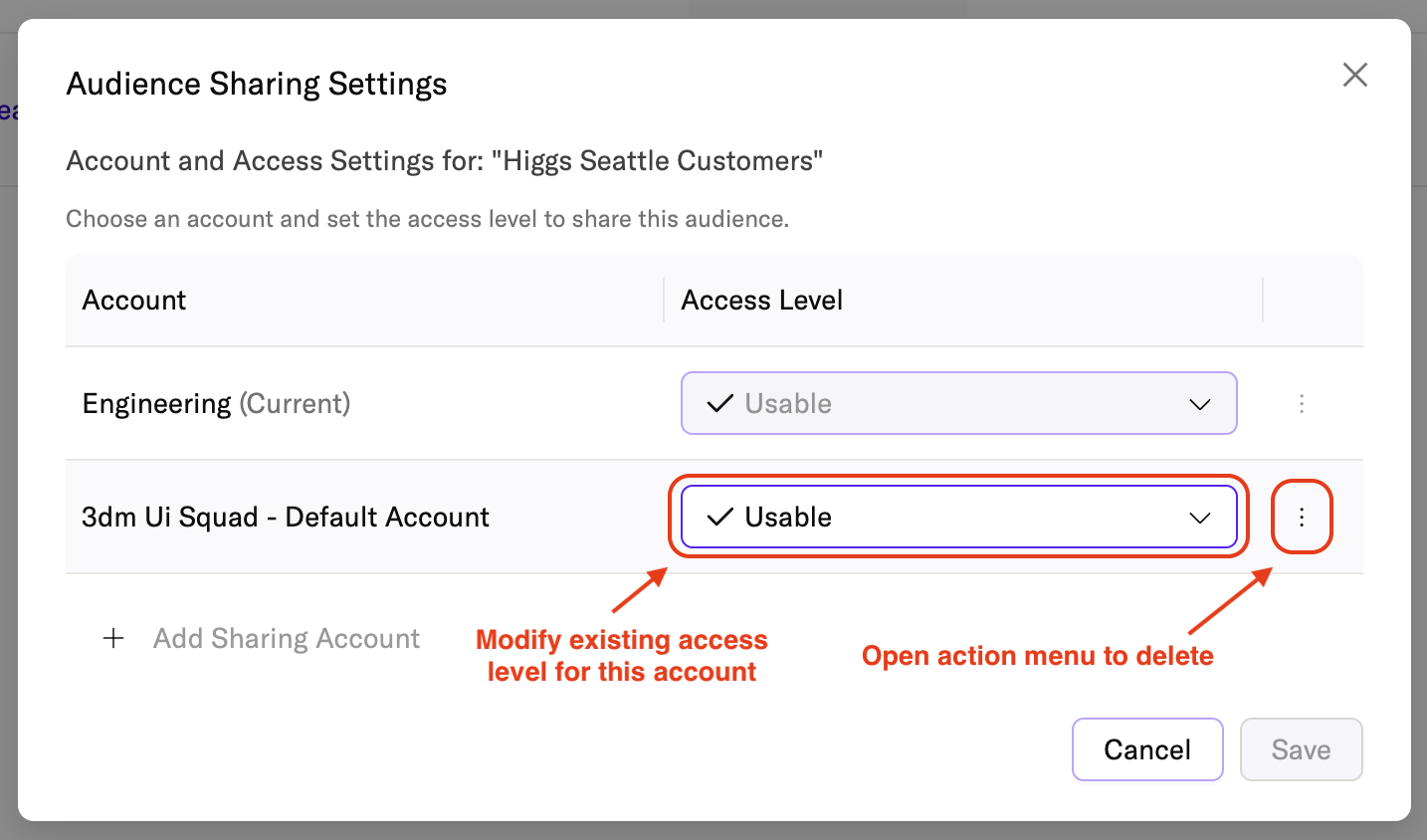 Audience sharing allows you to grant different levels of access to audiences created in other accounts. For example, an organization that separates its global brand and regional locations into different accounts can use audience sharing to distribute audience definitions to different teams. The global marketing team might create a “High-Value Customers” audience based on purchase activity and engagement metrics, then share it with regional accounts.