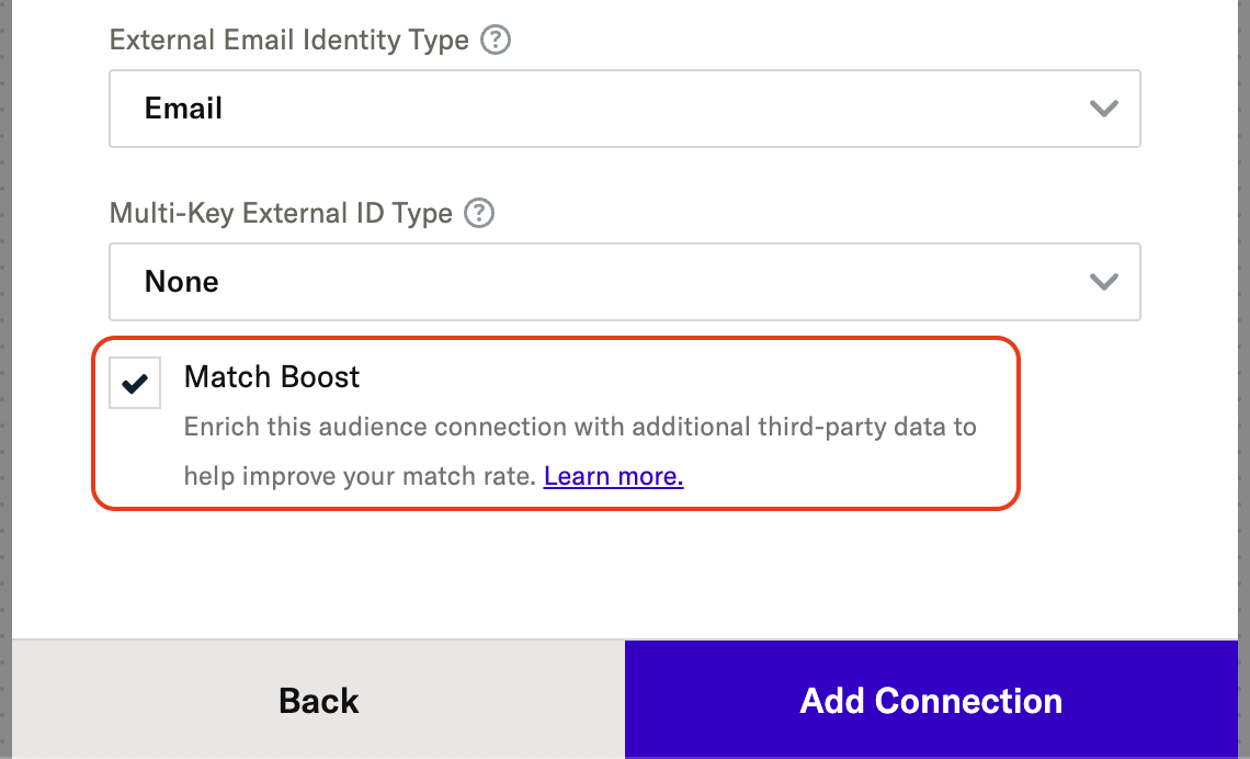 Because it is possible to have multiple connections between a single audience and several outputs, Match Boost is turned on at the level of an individual connection. This provides the greatest level of control over which forwarded audiences are enriched. For example, you could connect one audience to both Meta (Facebook) and Google Ads, but only boost the audience data that is sent to Facebook.