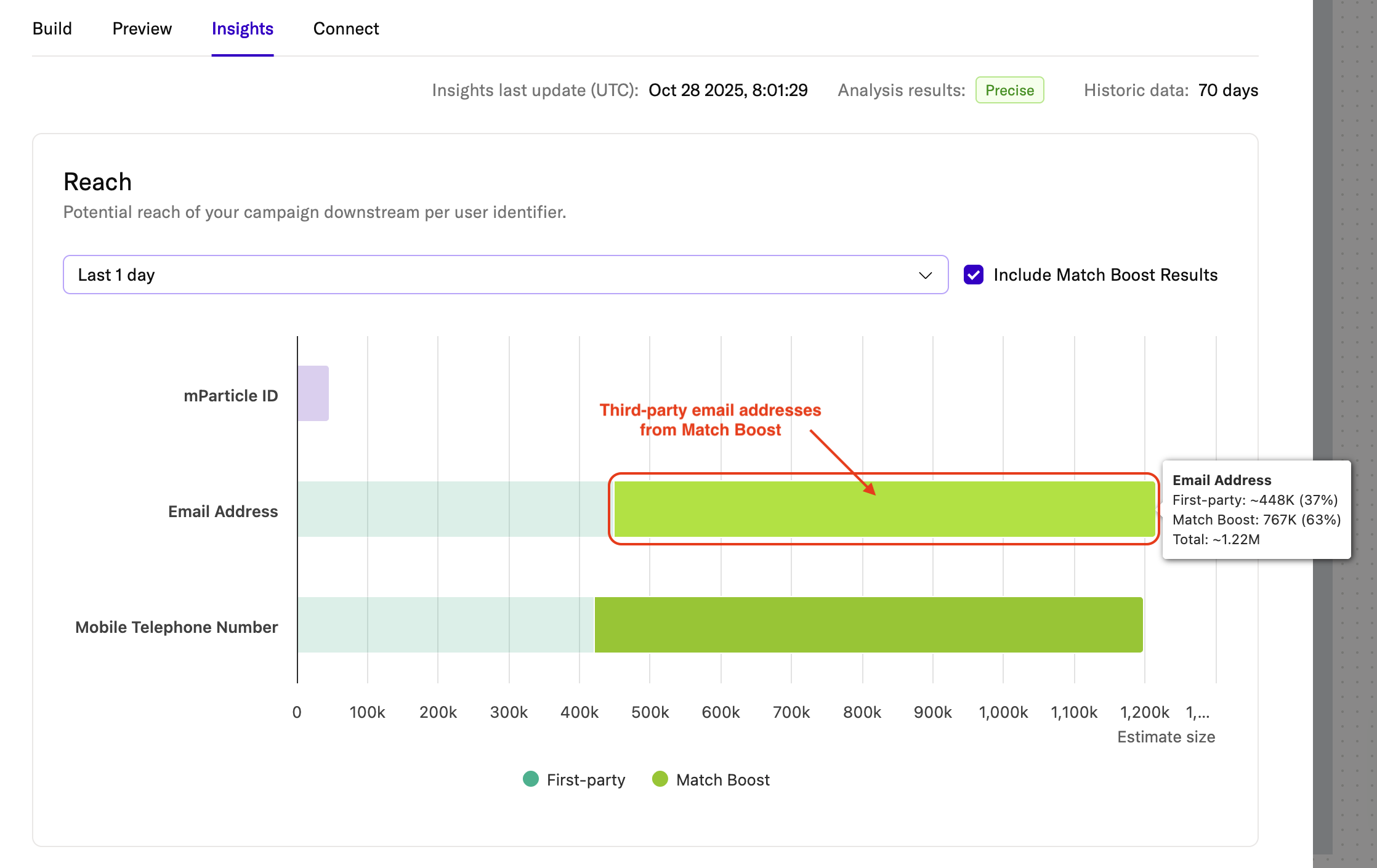 Hover your cursor over the “Third-party data” segment to see how many identifiers were enriched through Match Boost: